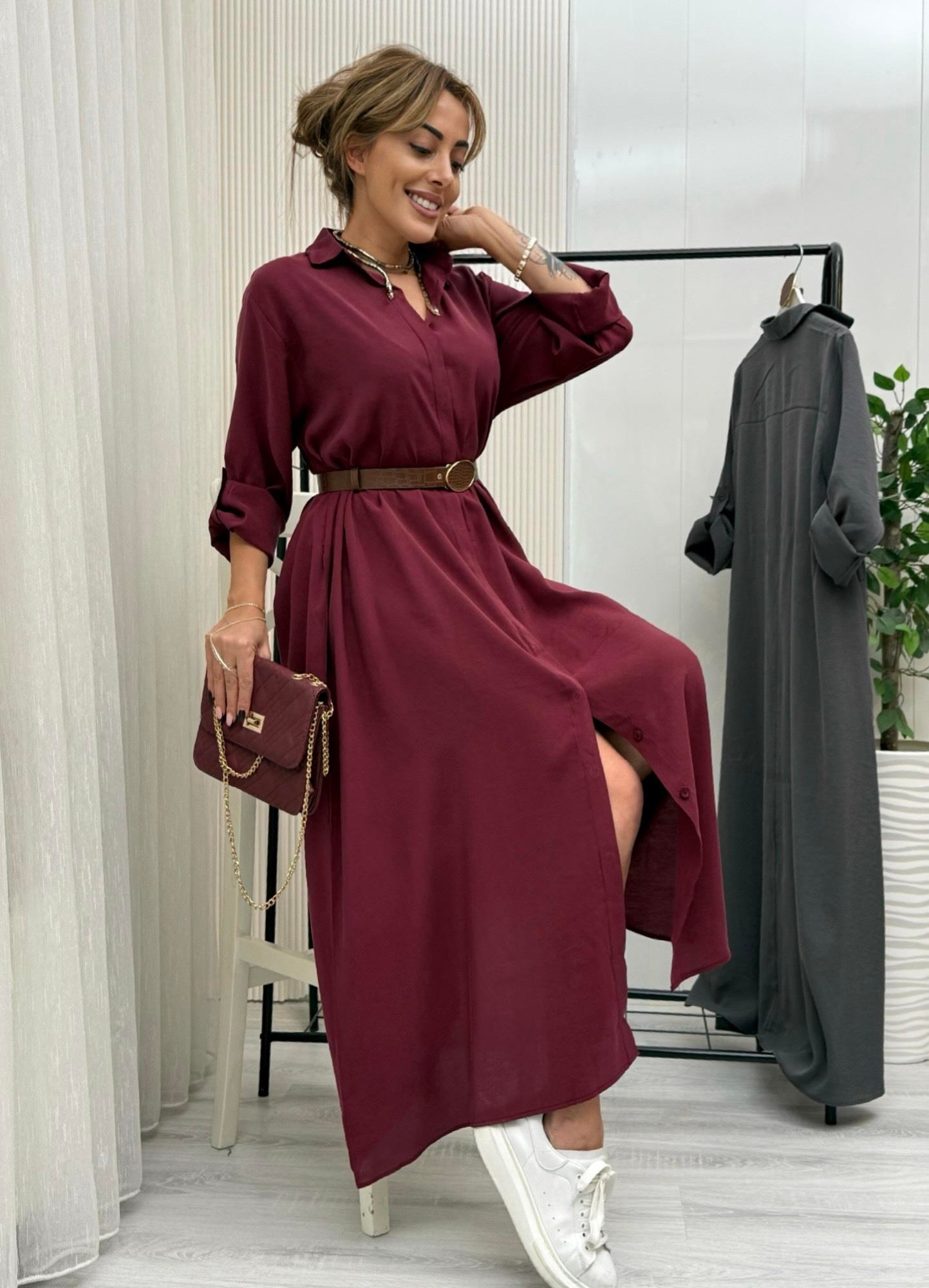 MODAYBUTİKRiva Kemerli Bordo Gömlek Elbise